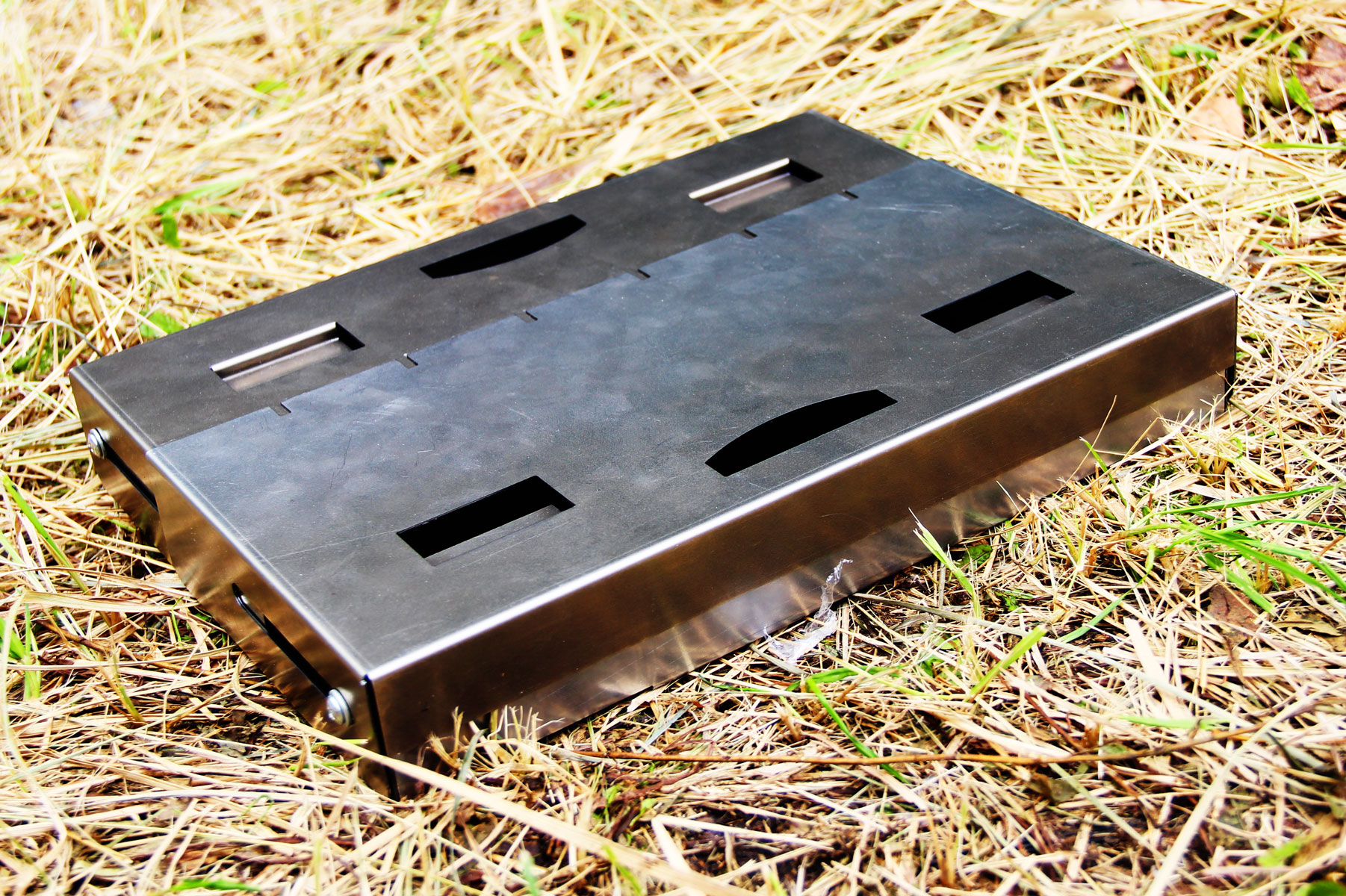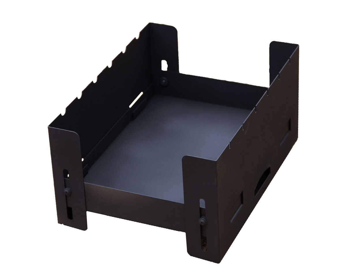 Легкий, компактный. В сложенном виде представляет собой прямоугольную металлическую коробку в которую можно поместить необходимые для розжига предметы. Легко раскладывается. Для установки мангала требуется буквально несколько секунд. Удобен в использовании.
