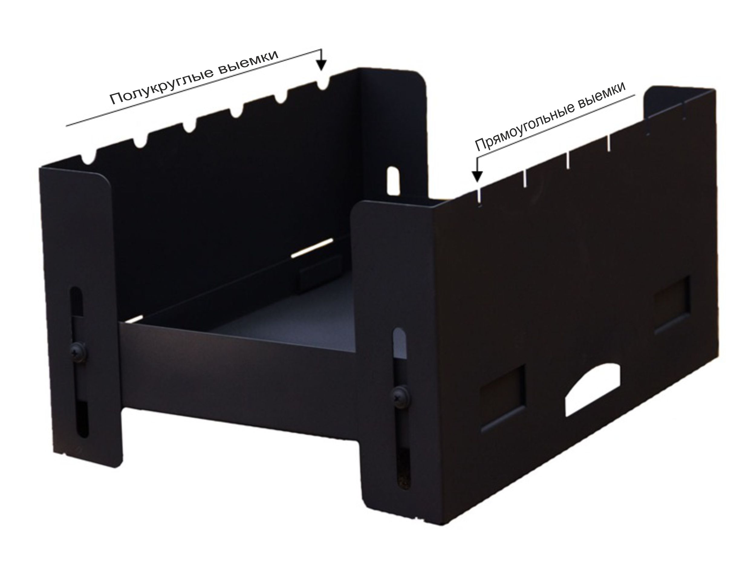 Мангал состоит из двух боковых стенок и дна. Стенки мангала имеют шесть выемок под шампуры. Выемки на стенках разные. На одной стенке они исполнены полукругом, на другой прямоугольные. Устройство выемок подобным образом исключает самопроизвольный проворот шампуров в процессе использования.