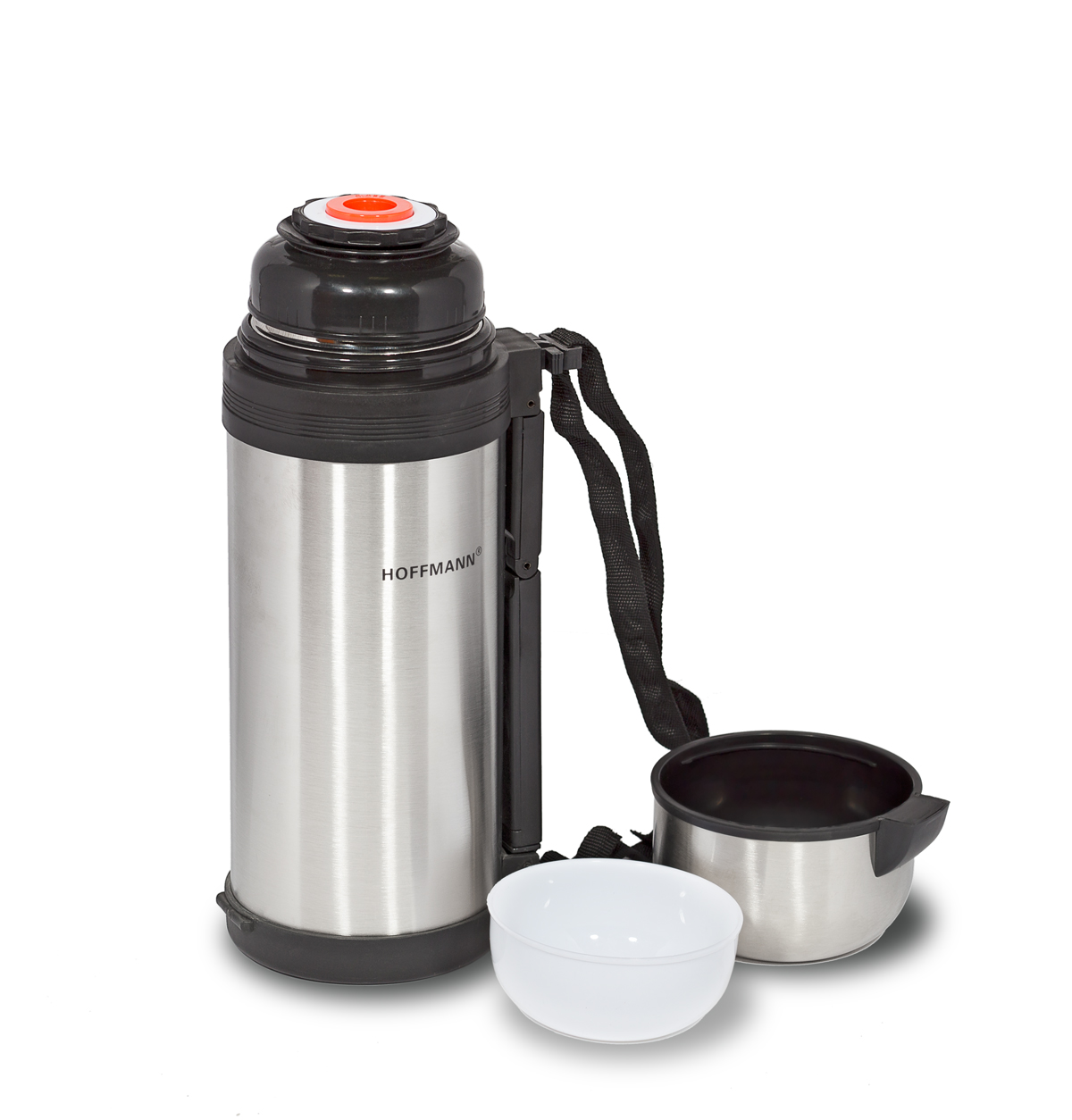 Термос Hoffmann HM 4118 универсальный (в том числе и пищевой) с ручкой и широкой горловиной. Объем 1,8л. Изготовлен из нержавеющей стали. Очень легкий и удобный в использовании. С крышкой-чашкой и двойными стенками. Моется в посудомоечной машине. Пробка легко фиксируется.