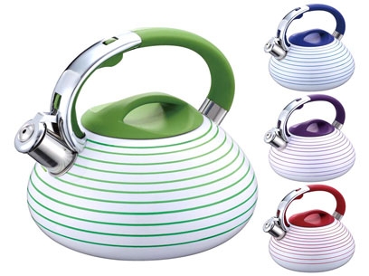 Чайник со свистком Peterhof PH 15568. Высококачественная нержавеющая сталь 18/10 с цветным покрытием. Литое утолщённое дно. Ненагревающаяся силиконовая цветная ручка. Подходит для электрических плит. Цвет покрытия и ручки: фиолетовый, зеленый, синий, красный. Емкость - 3,0 л