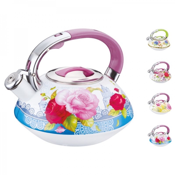 Чайник со свистком Peterhof PH 15607. Эмалированное покрытие. Удобная ручка из бакелита. Подходит для всех видов кухонных плит, включая индукционные. Можно мыть в посудомоечной машине. Емкость – 3,0 л.
