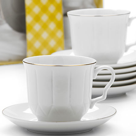 Чайный набор LORAINE на 6 персон, изготовленный из высококачественной керамики изысканного белого цвета, состоит из 6-ти чашек и 6-ти блюдец. Изделия набора украшены тонкой золотой каймой и имеют красивый и нежный дизайн. Набор придется по вкусу и ценителям классики, и тем, кто предпочитает утонченность и изысканность. Он настроит на позитивный лад и подарит хорошее настроение с самого утра. Набор упакован в подарочную упаковку. Такой чайный набор станет прекрасным украшением стола, а процесс чаепития превратится в одно удовольствие! Это замечательный выбор для подарка родным и друзьям!