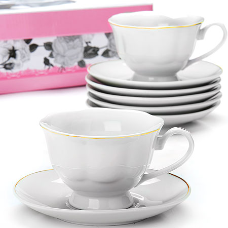Чайный сервиз LORAINE на 6 персон изготовлен из качественного фарфора и оформлен золотой каймой. Элегантный и удобный чайный сервиз не только украсит сервировку стола, но и поднимет настроение и превратит процесс чаепития в одно удовольствие. Сервиз состоит из 12 предметов: 6-ти чашек и 6-ти блюдец, упакованных в подарочную коробку. Чашки имеют удобную, изящную ручку. Изделия легко и просто мыть. Чайный сервиз прекрасно подойдет в качестве подарка для родных и друзей на любой праздник!