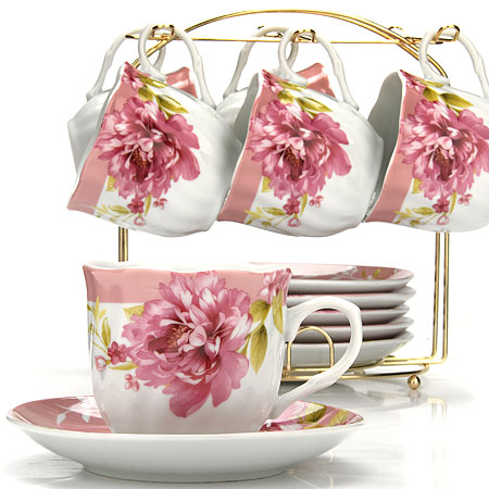 Чайный набор LORAINE на 6 персон состоит из 6-ти чашек, 6-ти блюдец и металлической подставки золотого цвета. Предметы набора изготовлены из качественного фарфора и оформлены красочным цветным рисунком, стенки чашек имеют изящную волнистую поверхность. Элегантный дизайн придется по вкусу и ценителям классики, и тем, кто предпочитает утонченность и изысканность. Он настроит на позитивный лад и подарит хорошее настроение с самого утра. Чайный набор LORAINE идеально подойдет для сервировки стола и станет отличным подарком к любому празднику. Все изделия можно компактно хранить на подставке, входящей в набор. Подходит для мытья в посудомоечной машине.
