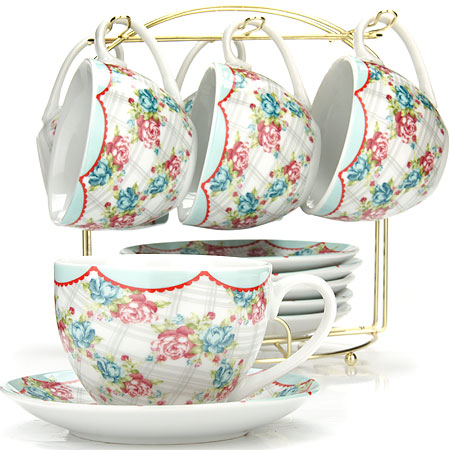 Чайный набор LORAINE на 6 персон состоит из 6-ти чашек, 6-ти блюдец и металлической подставки золотого цвета. Предметы набора изготовлены из качественного фарфора и оформлены красочным цветным рисунком. Элегантный дизайн придется по вкусу и ценителям классики, и тем, кто предпочитает утонченность и изысканность. Он настроит на позитивный лад и подарит хорошее настроение с самого утра. Чайный набор LORAINE идеально подойдет для сервировки стола и станет отличным подарком к любому празднику. Все изделия можно компактно хранить на подставке, входящей в набор. Подходит для мытья в посудомоечной машине.