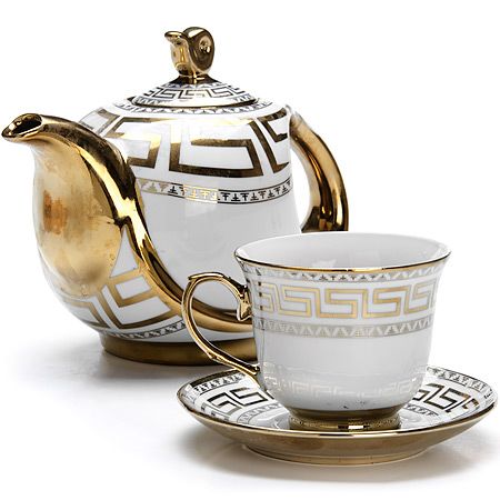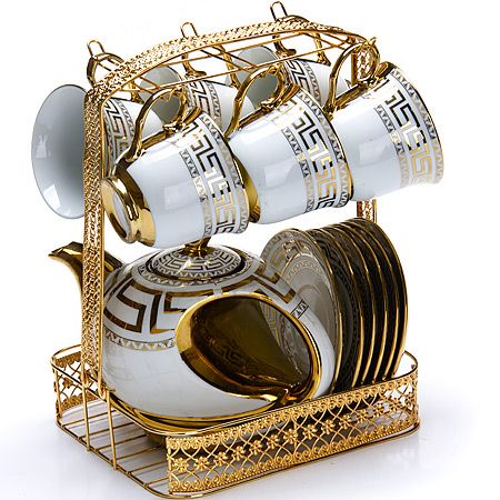 Чайный набор LORAINE состоит из шести чашек, шести блюдец и заварочного чайника. Предметы набора изготовлены из высококачественной керамики и оформлены золотым орнаментом. Все предметы располагаются на удобной металлической подставке с ручкой. Элегантный дизайн набора придется по вкусу и ценителям классики, и тем, кто предпочитает утонченность и изысканность. Он настроит на позитивный лад и подарит хорошее настроение с самого утра. Чайный набор идеально подойдет для сервировки стола и станет отличным подарком к любому празднику.