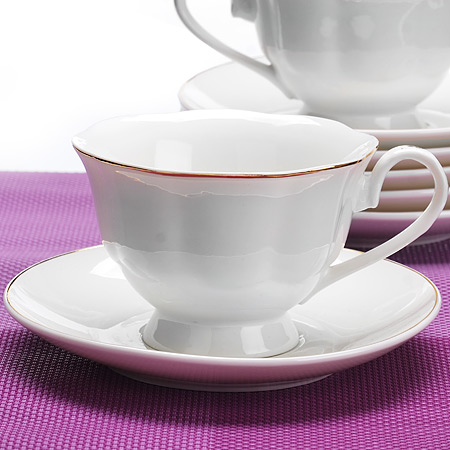 Чайный набор LORAINE на 6 персон, изготовленный из высококачественной керамики изысканного белого цвета, состоит из 6-ти чашек и 6-ти блюдец. Изделия набора украшены тонкой золотой каймой и имеют красивый и нежный дизайн. Набор придется по вкусу и ценителям классики, и тем, кто предпочитает утонченность и изысканность. Он настроит на позитивный лад и подарит хорошее настроение с самого утра. Набор упакован в подарочную упаковку. Такой чайный набор станет прекрасным украшением стола, а процесс чаепития превратится в одно удовольствие! Это замечательный выбор для подарка родным и друзьям!
