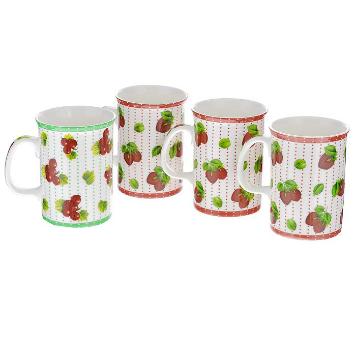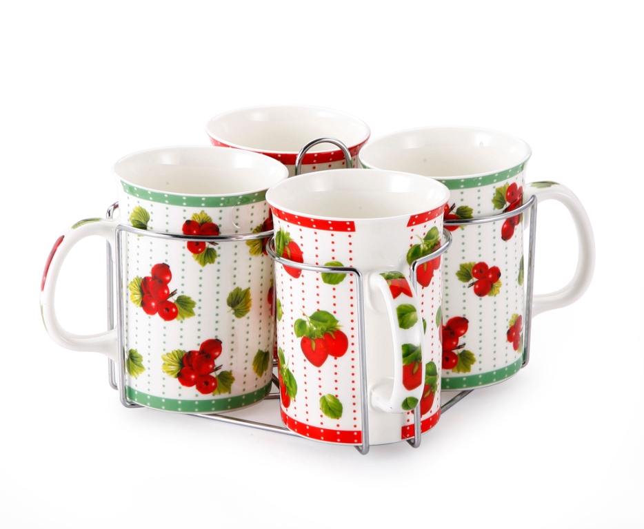 Чайный набор Wellberg WB 42503 изготовлен из фарфора "магнезия". В него входят 4 изящные кружки 300 мл декорированные ягодным рисунком и хромированная подставка.