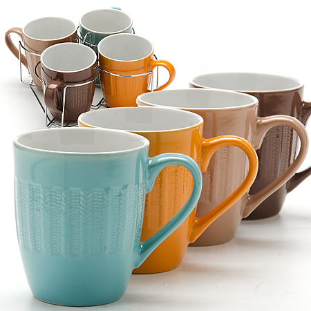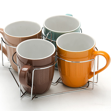 Цветной глиняный набор из 4-х чашек настроит на позитивный лад и подарит хорошее настроение с самого утра. За счет рельефной текстуры стенок, кружки приятно держать в руках. Элегантный дизайн придется по вкусу и ценителям классики, и тем, кто предпочитает утонченность и изысканность. Набор идеально подойдет для сервировки стола и станет отличным подарком к любому празднику. Изделия можно компактно хранить на подставке, входящей в набор. Подходит для мытья в посудомоечной машине.