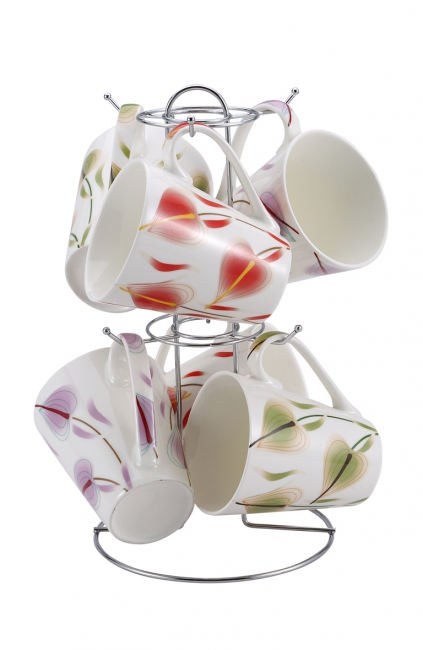 Чайный набор Wellberg WB 13506 изготовлен из фарфора "магнезия". В него входят 6 изящных вместительных кружек 320 мл (цветная деколь) и хромированная подставка.