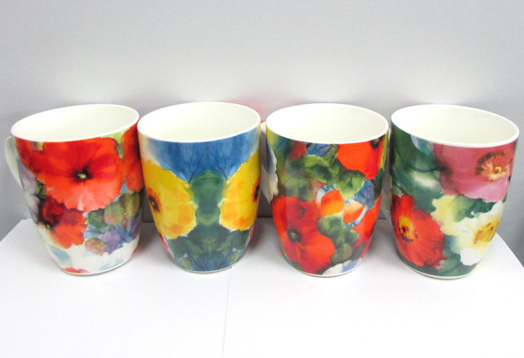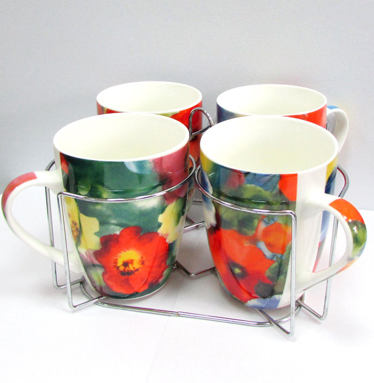 Чайный набор Wellberg WB 14230 изготовлен из фарфора "магнезия". В него входят 4 изящные вместительные кружки 330 мл (цветная деколь "акварель") и хромированная подставка.