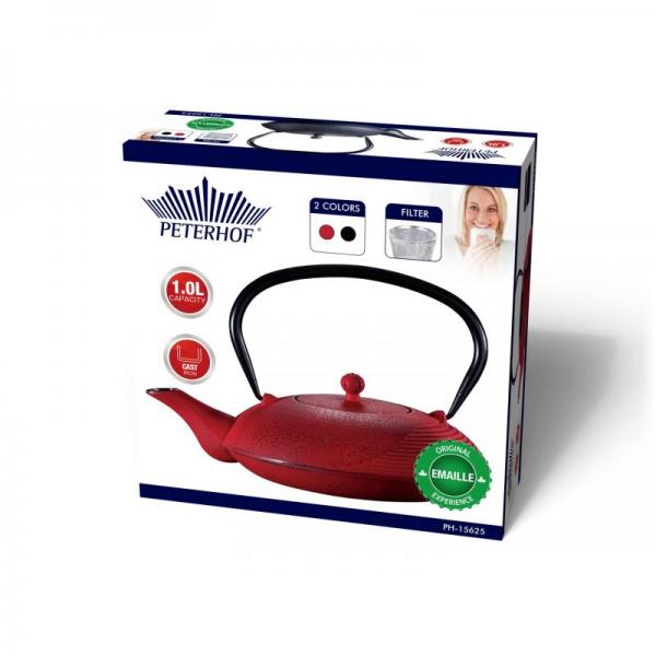 Чайник изготовлен из чугуна, его внутренняя поверхность полностью эмалирована, что защищает его от коррозии. Для удобства имеется ситечко для заварки из нержавеющей стали. Чугунный чайник дольше других удерживает тепло, а значит, вода в нём дольше всего будет оставаться горячей. Объем 1,0 л. Цвета: красный, черный.
